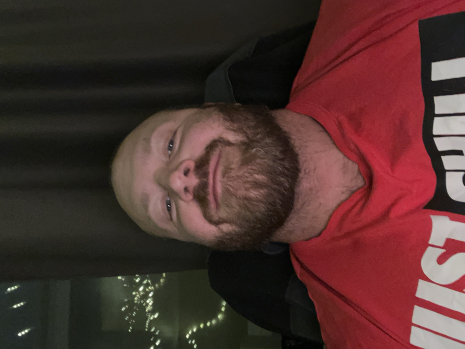 A fair-skinned, bald man with a reddish-brown beard smirks at the camera. He wears a red t-shirt with bold, white lettering. The backdrop features a dark, curtain-like fabric to the left and what appears to be a window at the bottom edge of the frame, revealing blurred lights. The image is slightly rotated, giving it a tilted perspective.