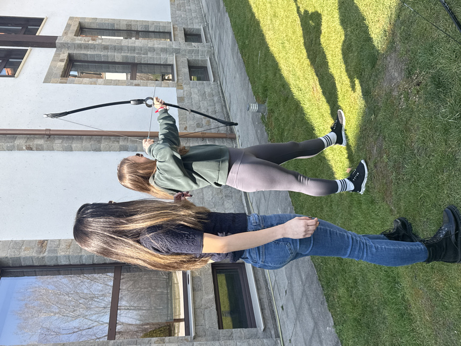 Two women are engaged in an archery activity outdoors in Duvanlii, Bulgaria, on a clear, sunny day. The scene is set on a manicured green grass lawn adjacent to a light-colored building with large windows and stone accents. The woman on the right, with lighter brown hair and wearing sunglasses, a green hooded sweatshirt, grey leggings, and black athletic shoes with white striped socks, is actively drawing a black recurve bow with an arrow, aiming forward. Her stance is focused on the task. Standing slightly behind and to the left of her is a second woman with long, dark hair, wearing a dark short-sleeved knitted top, blue jeans, and black combat boots. She is observing the archery activity, with her body oriented towards the archer. The background features a two-story building with a light-colored facade, possibly stucco or light stone, and multiple large, dark-framed rectangular windows. Some windows reflect a clear blue sky and bare trees, indicating a bright, possibly early spring or late autumn day. A concrete path borders the lawn on the left side of the frame. Shadows are cast on the grass, suggesting direct sunlight.