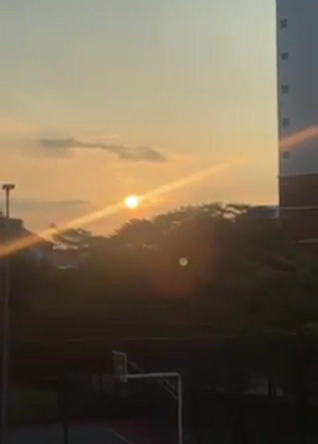 sunset over a basketball court and trees. The sun is a bright, orange orb in the sky, partially obscured by clouds. There is a basketball court in the foreground, with a hoop and a red and green surface. A building is visible on the right side of the frame. The trees are dark silhouettes against the bright sky. The video is shot from a slightly elevated position.