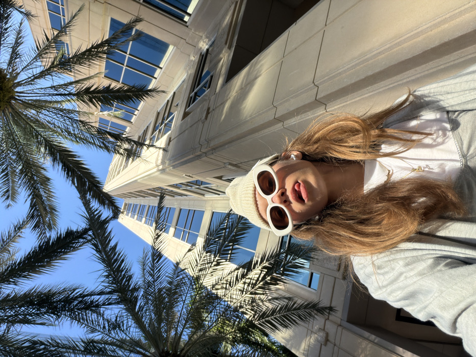 A blonde woman wears white-rimmed sunglasses and a beanie. She sticks out her tongue. Behind her, palm trees sway against a blue sky and a tall building with many windows. The woman wears a white t-shirt under a gray hoodie. Her light-colored hair is long and wavy. She is facing slightly to the right. The photo is taken from a low angle, looking up.