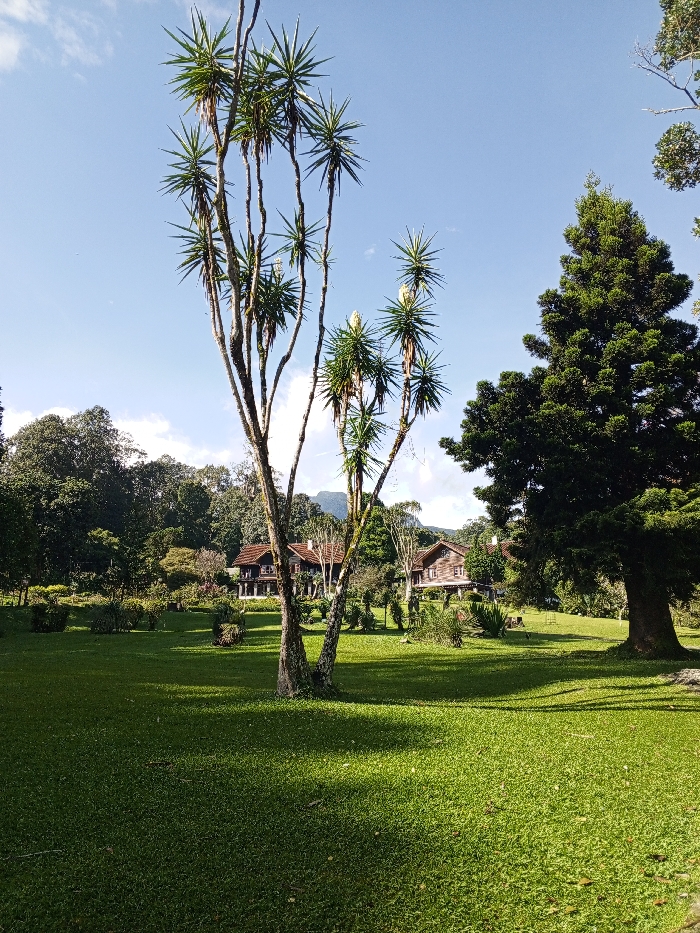 A scenic view of a lush green lawn under a partly cloudy sky. Tall, slender trees with spiky foliage stand prominently, casting shadows across the manicured grass. To the right, a large evergreen tree provides a dense, dark green contrast. In the background, two wooden houses with red roofs are nestled amongst the trees, evoking a sense of tranquility and seclusion. A mountain is barely visible in the distance.