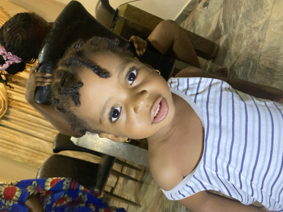 A young child with brown skin and braided hair poses for the camera, wearing a blue and white striped tank top and gold hoop earrings