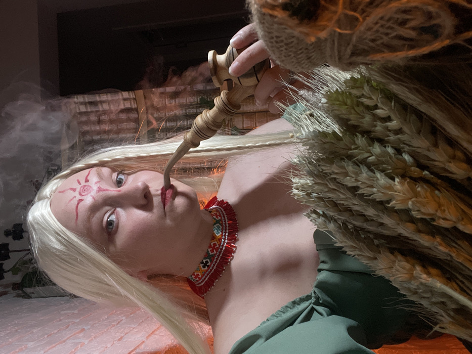 A young woman with long blonde hair is smoking a pipe. She is wearing a green dress and a red and white beaded necklace. The woman has a red symbol painted on her forehead, and her lips are painted red. She is sitting in a dimly lit room. The background is blurry, but it appears to be a bookshelf. The woman is holding the pipe in her right hand and her left hand is out of view. In the foreground, a bundle of wheat stalks is visible. There is a faint smell of smoke in the air. The location is Unknown, Unknown, with coordinates (latitude: 666, longitude: 666).
