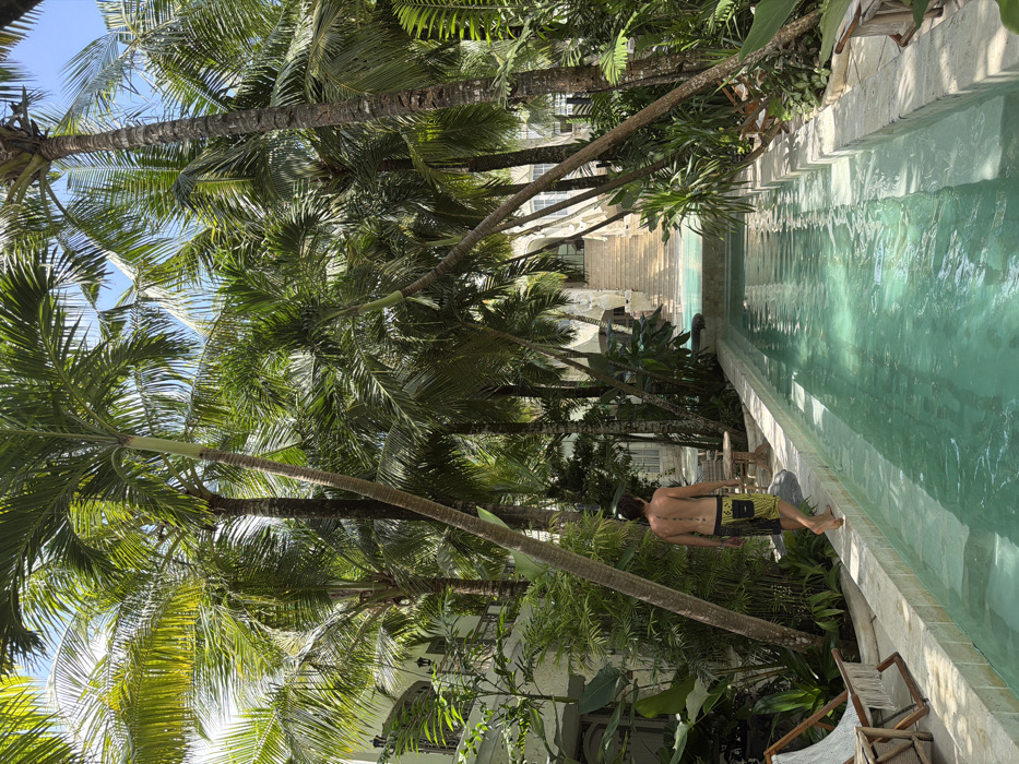 The image depicts a lush tropical resort environment in Jimbaran, Indonesia, dominated by numerous tall palm trees and dense green foliage under a clear sky. A narrow, multi-level swimming pool with light turquoise water extends from the foreground into the mid-ground, bordered by light-colored stone coping. In the left mid-ground, a shirtless male individual with brown hair stands barefoot, facing away from the camera. He wears dark swim shorts with yellow patterns on the lower half and exhibits a tattoo centered on his upper back/spinal column. He is walking along the left edge of the pool's coping, with his left foot appearing to be in mid-stride. To the left of the pool, partially visible, are light-colored wooden lounge chairs with woven fabric and a small, rustic wooden table. Behind the man and partially obscured by trees, a light-colored building with windows and balconies is visible. In the background, a grand, light-colored stone staircase ascends towards another building or terrace, flanked by ornate architectural elements or statuary. The scene is brightly lit by natural sunlight, creating strong contrasts between highlights and shadows.