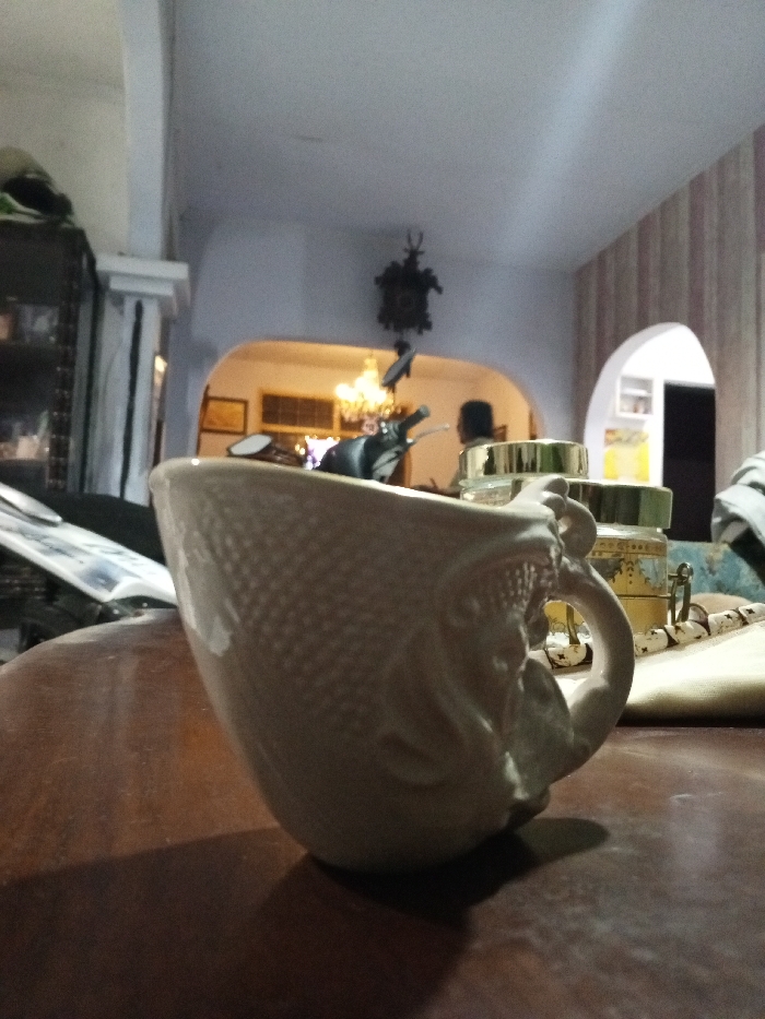 This image depicts an indoor scene in the city of Longmiang, Laos. In the foreground, a light-colored, possibly ceramic, mug with a textured, scale-like pattern and an ornate handle rests on a dark wooden surface. A shadow from the mug extends across the table. Behind the mug, to the right, several small, clear jars with gold-colored lids are visible. To the left, an open magazine or book lies on a dark surface. The midground shows a room with light-colored walls and ceiling. A dark, ornately carved cuckoo clock hangs on the wall. Two arched doorways or openings lead to other parts of the interior. Through the left arch, a warm-toned chandelier is visible, illuminating the background, and the silhouette of a person, facing away, is present. A partial view of a dark scooter or motorcycle's handlebars and mirror is visible below the cuckoo clock, within the left arched area. The right arched opening reveals a room with light-colored vertical striped wallpaper and a further doorway. The overall lighting is subdued. No direct actions or interactions are depicted.