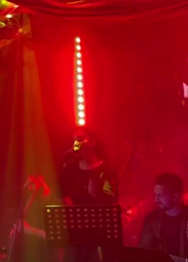 A woman with long hair stands in front of a microphone and a music stand, singing, while a man plays an acoustic guitar to her right. A third person is dimly visible to her left. The scene is bathed in red lighting, with a column of lights directly above the singer. Confetti is scattered in the background, and there appears to be a disco ball above the scene.