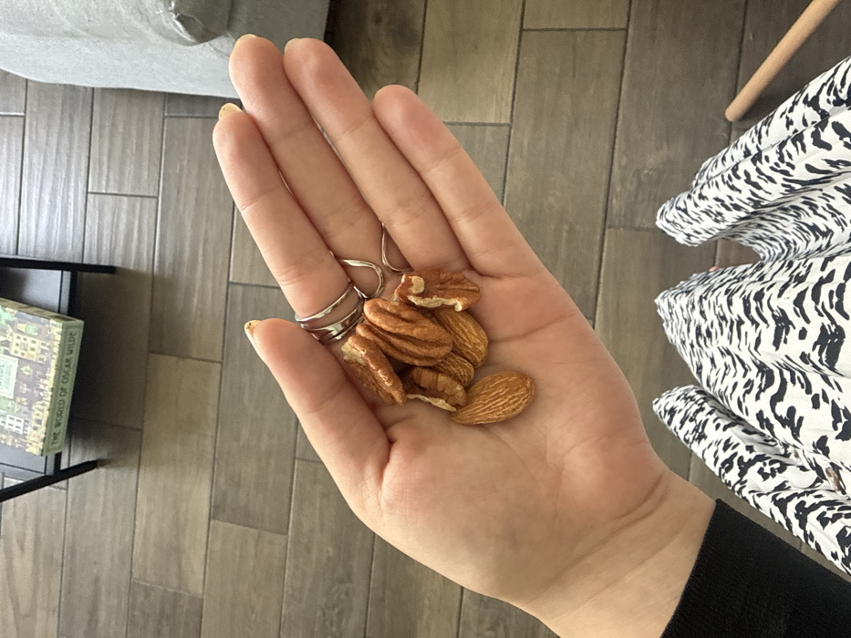 - "A hand holds a small pile of pecans and almonds" by FM-avfjN2, licensed under CC BY 4.0