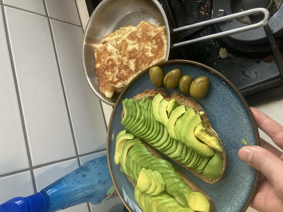 The image displays a domestic kitchen setting in Givatayim, Israel. In the foreground, a light-skinned hand holds the rim of a round, blue-grey speckled ceramic plate. The plate contains two slices of toasted bread, each topped with fanned slices of green avocado. Four large, pitted green olives are positioned to the right of the toast. A small green seed or crumb is visible on the plate's edge near the thumb. In the midground, a stainless steel frying pan containing a golden-brown, folded omelet rests on a black gas stovetop. The stovetop surface appears used, with minor food remnants. In the background, a light blue plastic spray bottle stands against a white tiled wall with horizontal grey grout lines. The scene depicts a prepared meal.