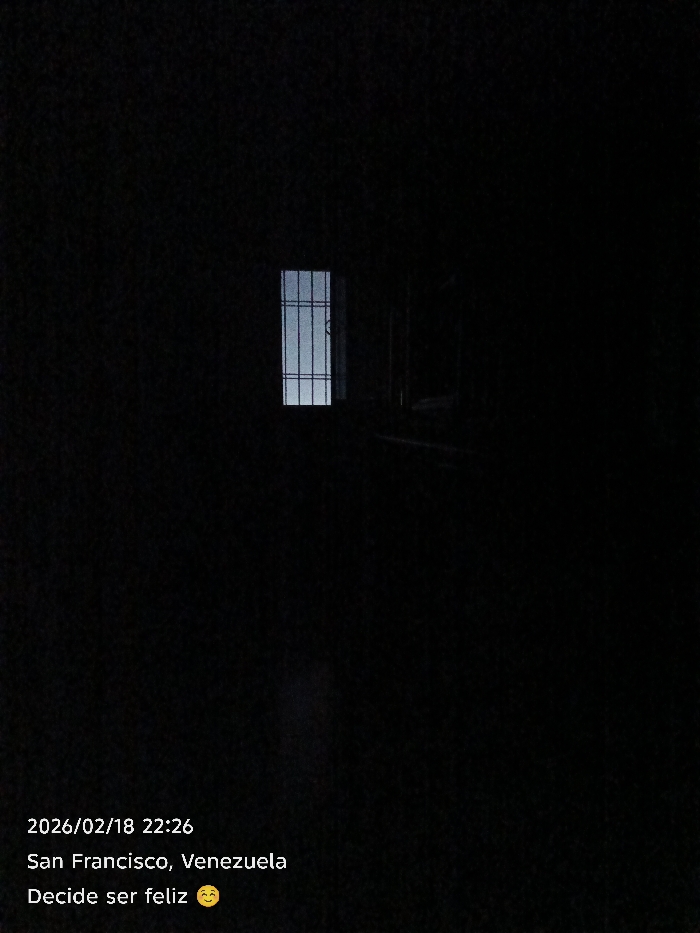 A dimly lit, nearly black room reveals a window with a barred frame. Light filters through, revealing a hint of the outside. A small, unseen object sits beneath the window. The bottom of the frame has textual overlayed content which includes the date "2026/02/18 22:26" and the location, "San Francisco, Venezuela" as well as a caption that says "Decide ser feliz".