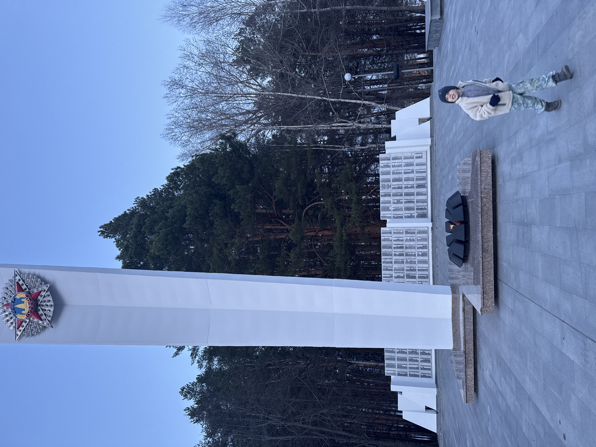 A child in a winter coat and hat stands on a gray tiled plaza. Behind the child is a white concrete monument with a large metal emblem on its face. To the side of the monument is a series of concrete walls with grid-like patterns. An eternal flame is visible in front of the wall. In the background, trees are visible against a blue sky. The scene is likely the Victory Park memorial in Chaikovsky, Russia.