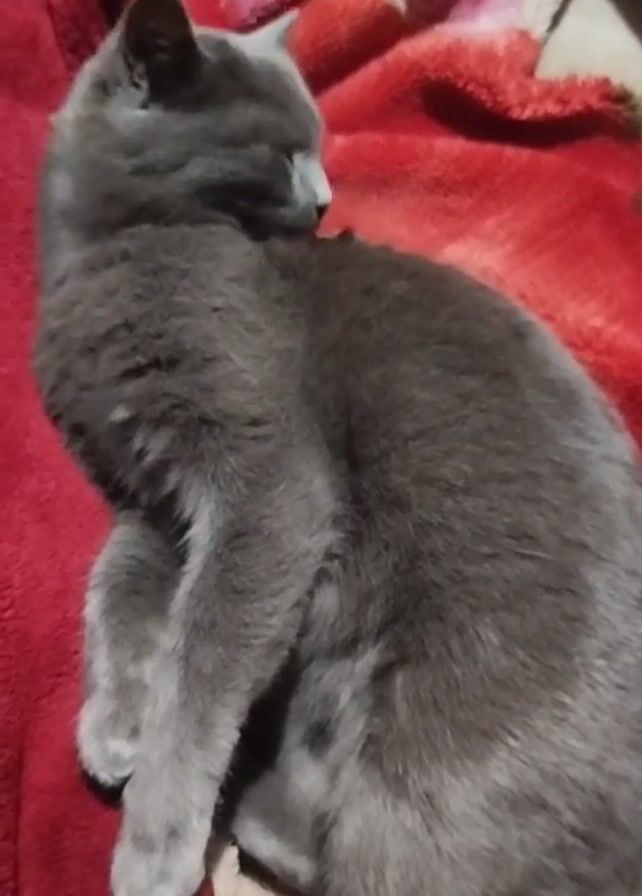 A gray cat is sleeping on a red and white blanket. The cat is curled up with its head turned away from the camera. It has short, gray fur and a sleek body. The blanket is soft and has a mix of red and white colors in a patterned design. The scene is well-lit.
