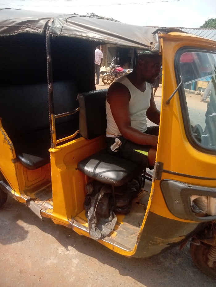 The image captures a static outdoor scene in Enugwu-Ukwu, Nigeria, during daylight hours. A yellow and dark grey commercial tricycle (keke napep) dominates the foreground, viewed from its right-front side. A dark-skinned male, identified as the driver, occupies the right-hand seat, wearing a white sleeveless undershirt and dark shorts with a neon green stripe. A crumpled white object rests on his left thigh. The tricycle's passenger compartment, visible on the left, contains black padded seats. A black plastic bag is situated on the floor beneath the driver's seat. In the background, a male in a light-colored shirt stands to the left of a red motorcycle. Distant, rudimentary structures with corrugated metal roofs are visible under a bright, possibly hazy, sky. The ground surface beneath the tricycle is unpaved and uneven.