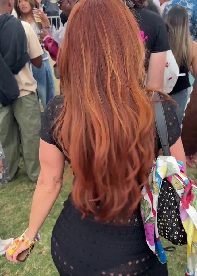 The video depicts a large crowd of people at a music festival. The initial shot focuses on a woman with long auburn hair, a black dress, and sunglasses, who is walking through the crowd, carrying a colorful floral tote bag. The camera shifts to show a wider view of the crowd, moving towards the stage. The stage is large with a large screen displaying colorful and abstract visuals. The crowd consists of people of various ages, appearances, and attire. Some individuals are wearing hats, others sunglasses. The sky is overcast, indicating that the video may have been taken in the late afternoon. The background music suggests an upbeat and energetic atmosphere.