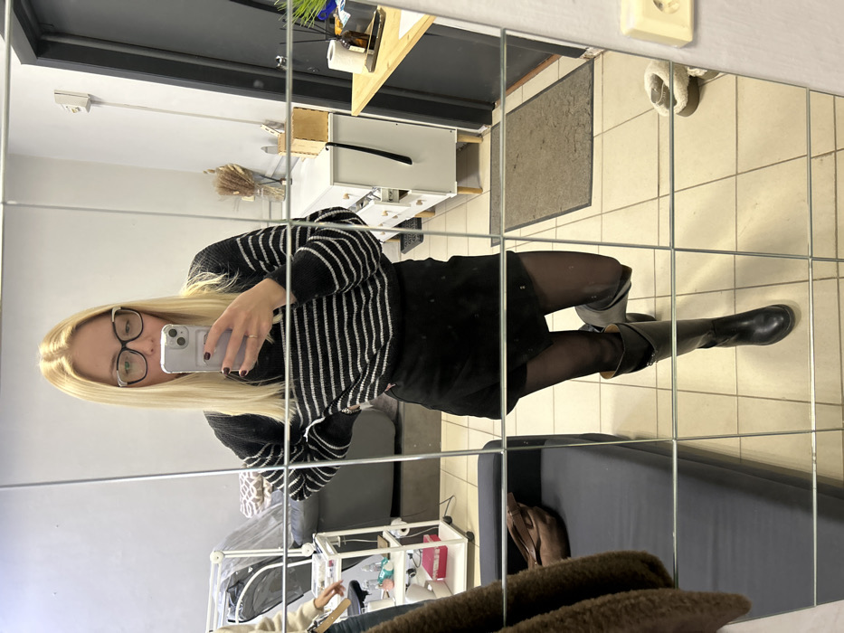 The image captures an interior scene, reflected in a segmented mirror, within a commercial establishment in Voskresensk, Russia. The primary subject is a fair-skinned female, positioned centrally, taking a selfie. She has long blonde hair, wears black-rimmed glasses, a black and white horizontally striped long-sleeved sweater, a black mini-skirt, sheer black tights, and black knee-high boots. She holds a light-colored smartphone with a multi-lens camera in her right hand, extended to capture her reflection, while her left hand rests on her hip. Dark nail polish is visible on her fingers. In the reflected background on the left, a second individual is partially visible, wearing a light-colored top and blue jeans, standing near a white, three-tiered rolling utility cart holding various small bottles and containers, indicative of a beauty or personal care setting. Behind the cart, a dark gray sofa or bench is visible, with a brown handbag resting on it. A textured, brown, fuzzy garment is draped over a foreground object. On the reflected background's right side, a white dresser with light wooden drawers and legs is present. On its top surface are decorative dried plant stalks in a vase, a small wooden box, and other items; one drawer is slightly open. Adjacent to this, a dark wooden countertop holds a brown bottle, a roll of white paper (possibly tissues), and artificial green foliage. The floor is tiled with light-colored square tiles, with a dark rectangular mat visible near the dresser. A pair of light-colored, possibly fur-lined, slippers are on the floor in the lower right. The walls are light gray or white, and an electrical outlet is visible on the far right wall, alongside a dark doorframe. The room is uniformly lit by interior artificial lighting.
