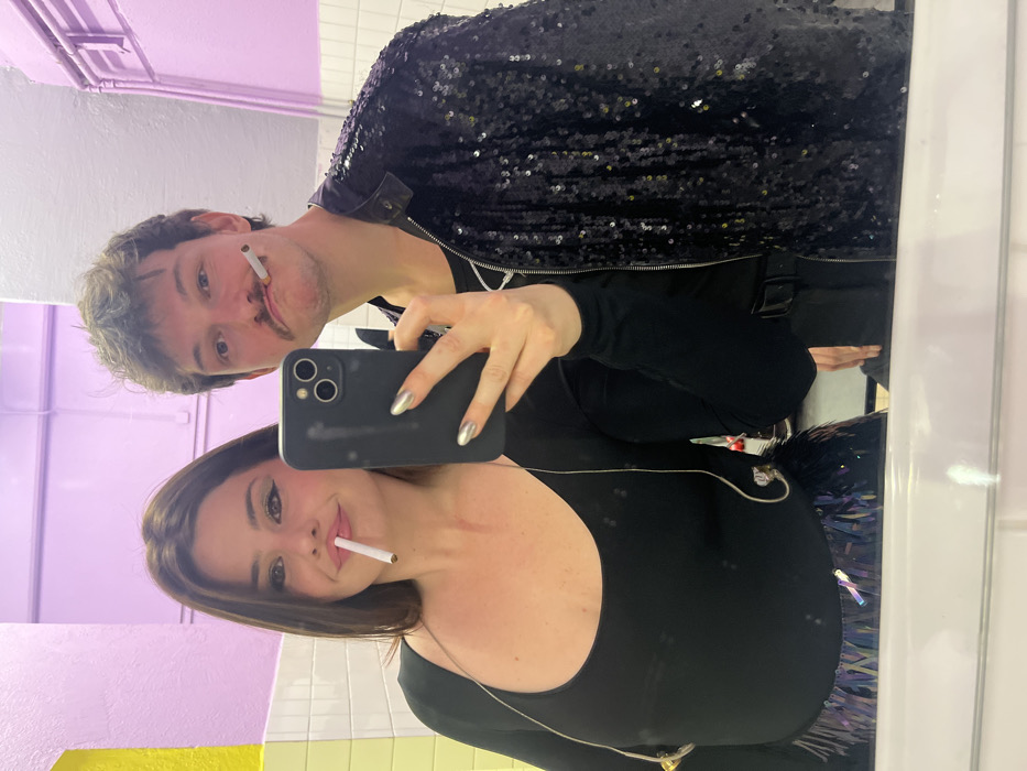 A mirror selfie shows a woman and a man, each holding a cigarette in their mouths. The woman has long brown hair and is wearing a black top. The man is behind her, wearing a black sequined jacket. The woman is holding a black phone to take the picture, her nails are painted silver. The background features a wall with alternating blocks of lavender, yellow, and white.