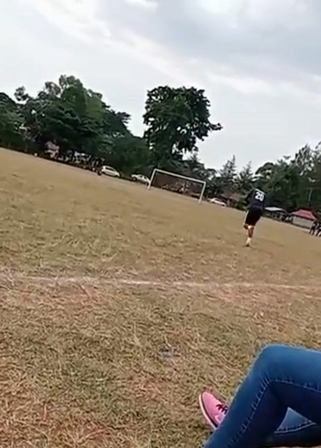 The video depicts an outdoor soccer field, likely during a game. A person, presumably a spectator, is sitting in the foreground, wearing jeans and pink sneakers. The person is holding a phone or similar device in their hand and also has a watch on their wrist. In the background, a soccer player wearing the number 20 on their back is running towards the goal. Other players and spectators are visible in the distance. The field is predominantly brown grass, and the sky is overcast. Cars can be seen parked beyond the field.