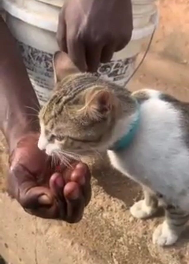 A man with dark skin offers water from his cupped hand to a grey tabby cat with white markings and a turquoise collar. The cat is standing on a concrete ledge. A white bucket is visible in the background.