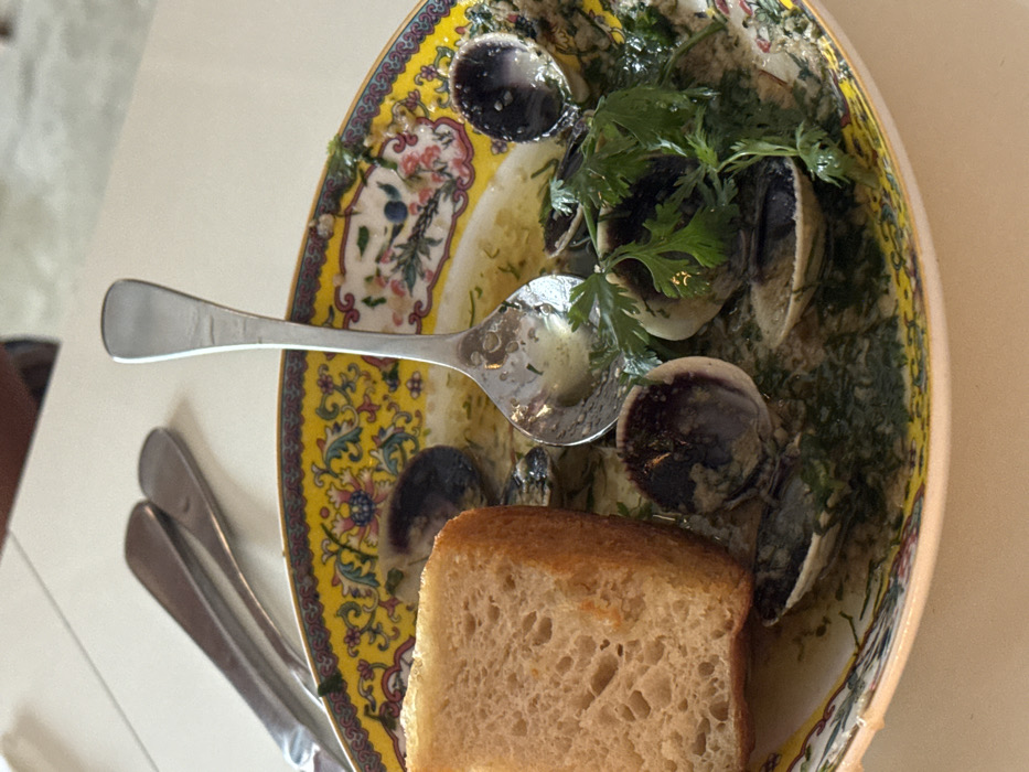 A decorative plate holds a clam dish garnished with parsley, alongside a slice of bread and a spoon