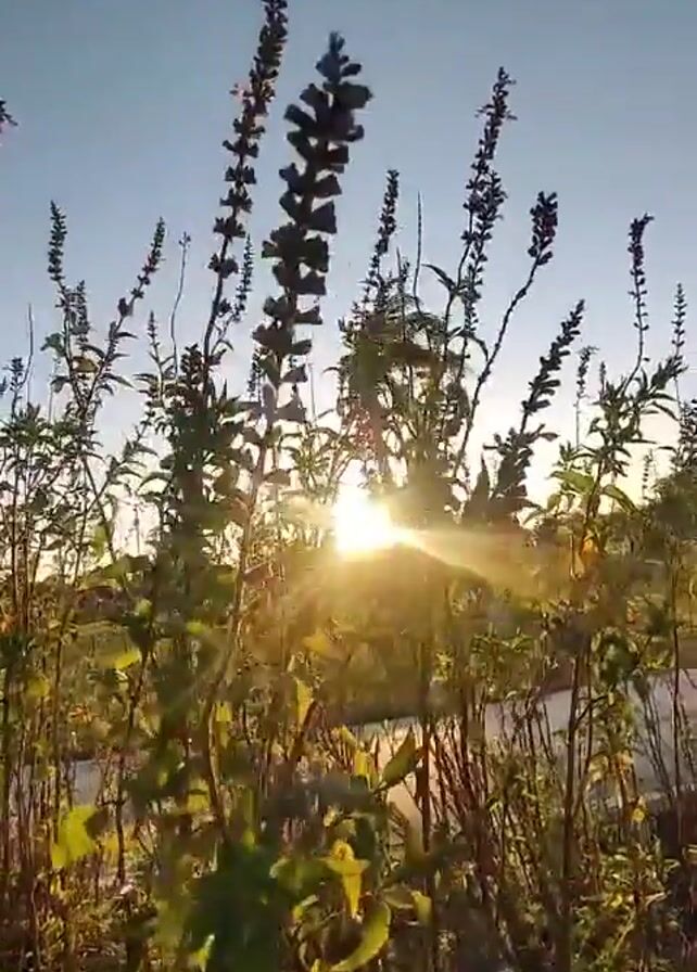 The sun is setting behind a thicket of plants, casting a golden glow. The plants appear to be tall weeds, with dark, elongated flower spikes. The sky is a clear, pale blue. In the distance, there appears to be a road or path. A faint popping sound can be heard.
