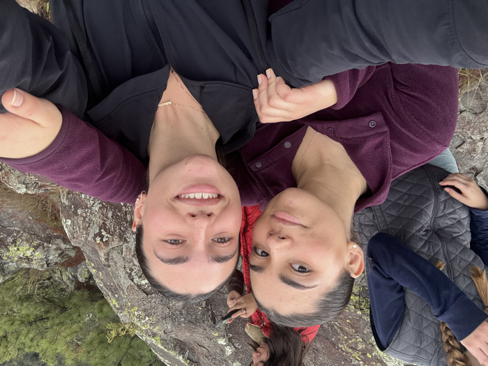 The image depicts four young adult females in a natural, rocky outdoor environment, consistent with the mountainous terrain in the vicinity of Huasca de Ocampo, Mexico. In the foreground, two females are positioned closely, appearing to take a selfie. The female on the left wears a dark purple fleece pullover, has dark hair pulled back, and a single pearl earring in her left ear; her left arm is positioned around the right female's shoulder. The female on the right, holding the camera, wears a black hooded jacket and a gold necklace with a "Roberta" pendant; her right arm is extended. Both foreground females are smiling and looking directly at the camera. In the background, on the left, a third female is partially visible from the chest up, wearing a grey quilted vest over a dark blue long-sleeved shirt, with a light-colored braid draped over her shoulder. On the right background, mostly obscured by a large rock, a fourth female in a red jacket is visible, looking down at a smartphone she holds. The environment consists of large, lichen-covered grey rock formations, sparse pine trees, and dry ground cover under an overcast sky.