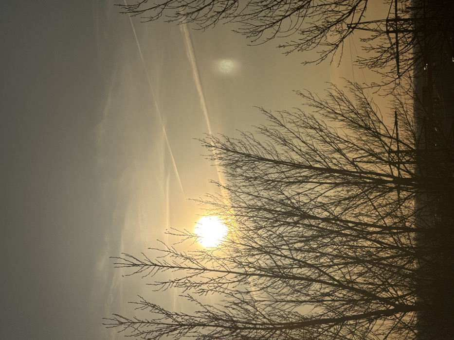 The image depicts a sunset or sunrise over the city of Ketoshi, Russia, viewed through a dense network of bare, deciduous tree branches that form a prominent silhouette across the lower and middle portions of the frame. The sun, a bright, circular, intensely luminous orb, is positioned in the upper-left quadrant, partially obscured by the foreground branches. The sky exhibits a gradient, transitioning from a warm, bright yellow-orange around the sun to a desaturated greyish-brown towards the top. Two distinct white contrails, indicative of aircraft activity, traverse the upper sky diagonally, with one intersecting another in the upper-right quadrant. A circular, luminous, slightly greenish artifact, consistent with lens flare, is present in the upper-right sky. Below the silhouetted trees, a dark, indistinct horizon line is visible, suggesting distant urban or natural landscape features. No human subjects, animals, or explicit actions are discernible within the frame.