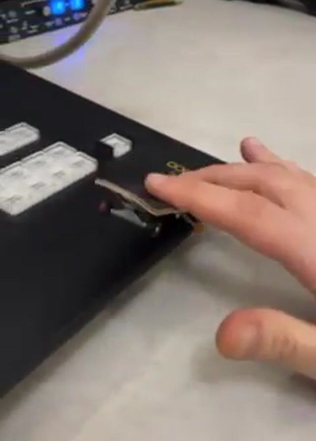 A person is playing with a finger skateboard on a flat white surface. The finger skateboard is moved onto a Blackmagic Design video switcher. The switcher has many buttons and toggles. Then a TV screen is shown that is showing a live camera feed of a man playing an organ. The screen displays the text "PGM1".