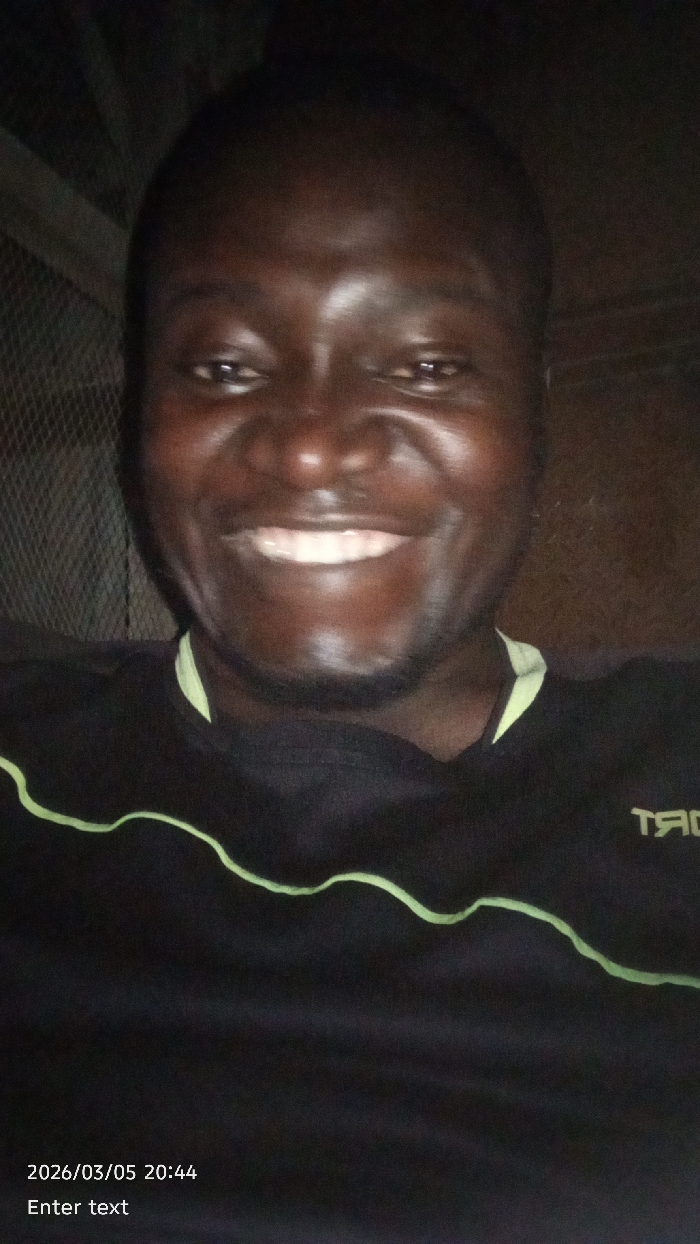 A close-up, frontal portrait shot in low light depicts a single adult male of dark complexion, centered in the frame. He is smiling broadly, revealing white teeth, and looking directly at the camera. He has short, dark hair and visible stubble on his chin and jawline. He is wearing a dark-colored short-sleeved t-shirt with a wavy, light green line design across the chest, and the mirrored text "SPORT" is visible on the upper right chest area. The background is dark and indistinct, with a dark, mesh-like or grid structure partially visible on the left side behind the subject. The bottom left of the image contains a digital overlay indicating "2026/03/05 20:44" and "Enter text." The scene is located in the city of Gwagwarwa, Nigeria.