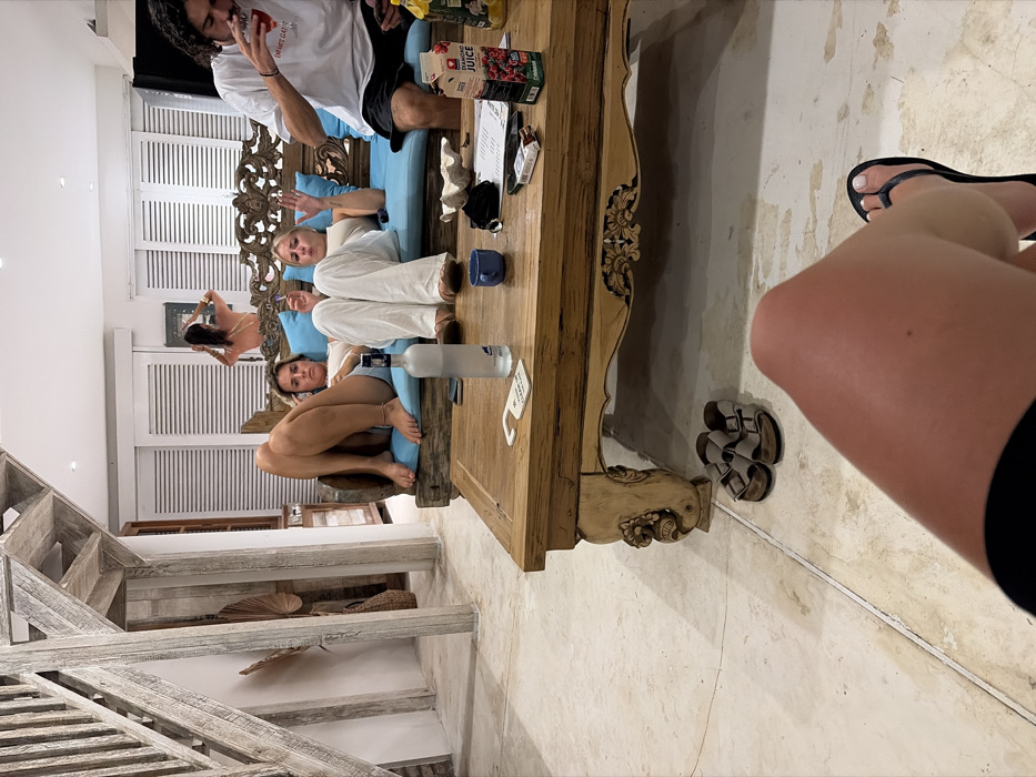 The image depicts an indoor social gathering within a living space in Pecatu, Indonesia