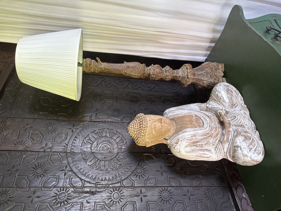The scene is an interior arrangement in Tibubiyu, Indonesia. A wooden statue of Buddha, with a natural wood and distressed white finish, sits in a meditative posture on a dark green table. The Buddha features a textured ushnisha and hands clasped in Dhyana Mudra. To the right and slightly behind the Buddha, a tall, ornate wooden lamp with a carved, light brown base and a pleated, off-white conical shade stands on the same green table. The table itself is painted dark green with a slight curve visible on its right side, featuring faint decorative accents. In the background, a dark wooden wall or panel is intricately carved with repeating patterns of concentric circles, sunbursts, and geometric shapes. To the far right, white, vertically pleated curtains are visible, suggesting a window or opening. The objects are static, arranged for display.