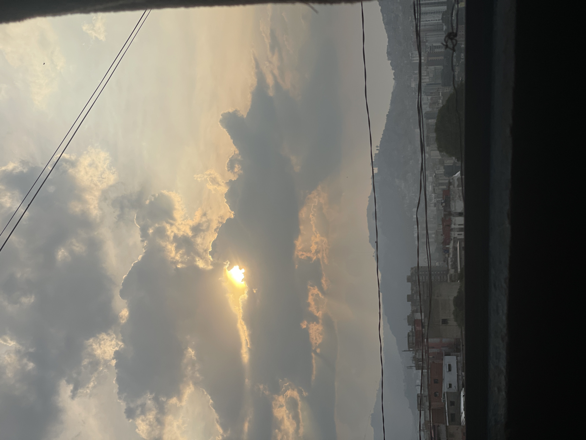The image captures a view of Caracas, Venezuela, through what appears to be a window. The foreground includes a blurry section of the window frame. Beyond the frame is a cloudy sky, with the sun partially obscured by the clouds, casting light rays downward. In the mid-ground is a cityscape ascending a hillside, with buildings of varying heights and colors. Power lines are visible, stretching across the sky. The overall scene suggests a hazy atmosphere.