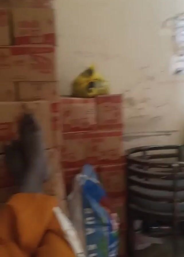 The camera pans up from a room containing furniture and stacks of boxes to a pair of bare feet resting on top of some of the boxes. The feet belong to someone wearing orange pants. The boxes are labelled with text, including "MAGGI SOYA CHUNKS" and "SHRIMP". A roll of tape, a notebook, and a small bag are on the ground near the boxes. The room appears to be a storage area or small shop. The walls are light-colored and have some writing and a poster on them.