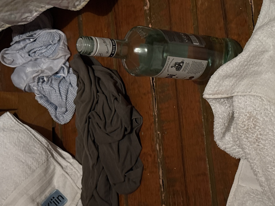 An overhead shot reveals a messy scene on a wooden surface. An empty glass rum bottle lies horizontally amidst piles of clothing. There's a folded blue and white striped item, a crumpled grey piece of apparel, and white towels present. The scene evokes a sense of disorder.