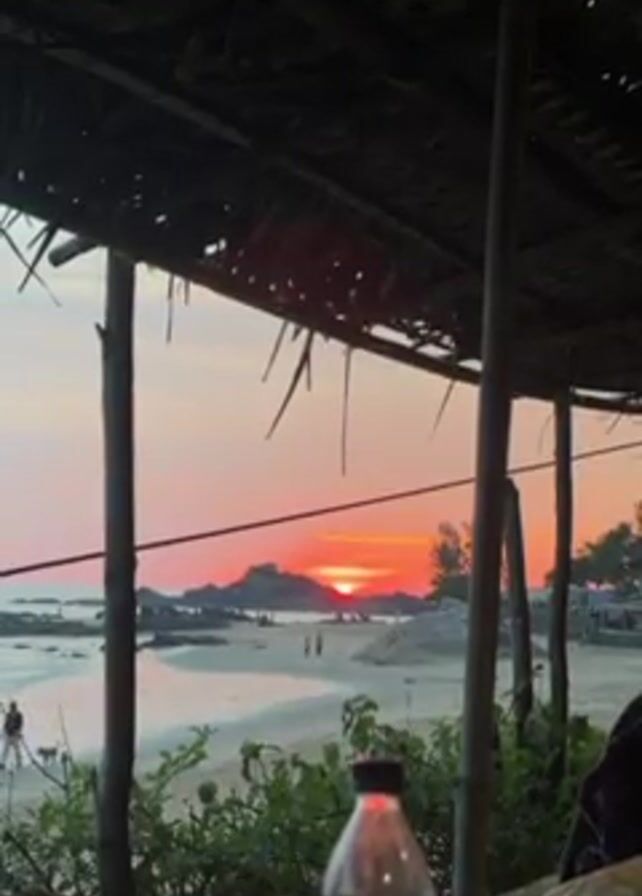 sunset over a beach, viewed from under a thatched-roof structure. The sun is setting behind rock formations in the sea, casting a red and orange glow on the sky and water. Several people are walking on the beach in the distance. A plastic bottle with liquid is visible on a surface in the foreground. The camera zooms in slightly.