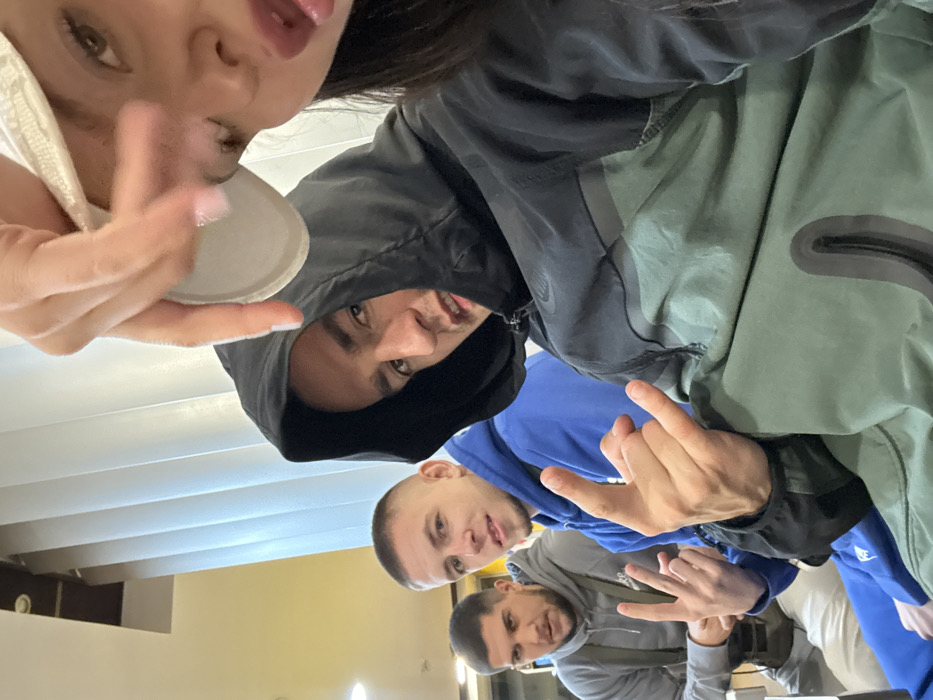 The image, captured in Studena, Bulgaria, displays four individuals in an indoor public setting. In the immediate foreground, the upper face of a person wearing a white cap is visible, with their right hand extended, holding a small, light-colored, circular object. Next to this person, a male in a two-tone hooded jacket (black upper, dark green lower) with a Nike logo on the left chest, looks directly at the camera with an open-mouthed expression and performs a "rock on" hand gesture with his right hand. To his left, another male with a short buzz cut, wearing a bright blue hoodie, also looks towards the camera while making a "peace sign" gesture with his left hand. Partially visible on the far left, a third male with a beard and a grey hoodie is seated, looking slightly to the right of the camera. The background consists of light-colored interior walls or columns, suggesting a commercial or institutional building.