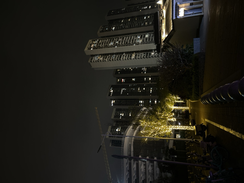 The image depicts an urban night scene within Huangpu District, China. Numerous modern, multi-story high-rise buildings, predominantly residential or office towers, dominate the background and mid-ground, with many windows illuminated. To the far left, a yellow tower crane indicates ongoing construction, adjacent to a multi-level, curved concrete structure, possibly a parking garage or part of a larger complex, also partially illuminated. A paved pathway, illuminated by warm yellow light, traverses the mid-ground. Trees lining this path are extensively wrapped with bright string lights. Along the left edge of the pathway, multiple parked bicycles and motorbikes are visible. A row of dark, hemispherical bollards delineates the right side of the path from a darker, adjacent paved area. In the foreground on the right, a traditional single-story Chinese-style building with a dark tiled roof and ornate eaves is present, its entrance area brightly lit. The sky is dark and overcast. No individuals are visible.
