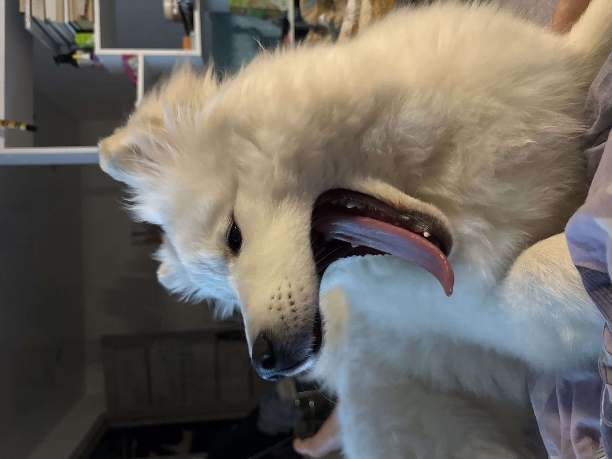 - "A close-up, partially inverted shot focuses on a large, fluffy, white dog, possibly a Samoyed or Great Pyrenees" by FM-dYnzW2, licensed under CC BY 4.0