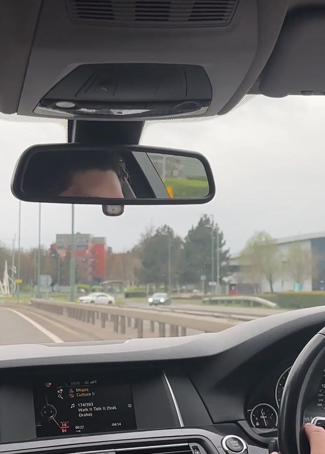 interior of a moving car from the driver's point of view. The driver, visible in the rearview mirror, is holding the steering wheel with their right hand. The dashboard shows the car's infotainment system displaying music information: "Migos - Culture II, Walk It Talk It (feat. Drake)". The car is moving on a road with other vehicles present. In the background, buildings, trees, and road signs are visible. The weather appears to be overcast. The car seems to be approaching a roundabout. The driver is wearing a wristwatch.