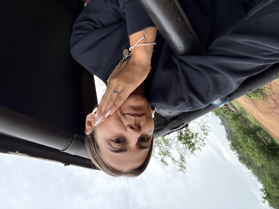 A woman in a black shirt poses in what appears to be an off-road vehicle. She has brown hair, brown eyes, and long white nails. She wears a gold chain necklace, a gold hoop earring, a ring, and a white bracelet. She is holding her hand to her face. The sky is overcast. The vehicle is surrounded by trees and a dirt road.