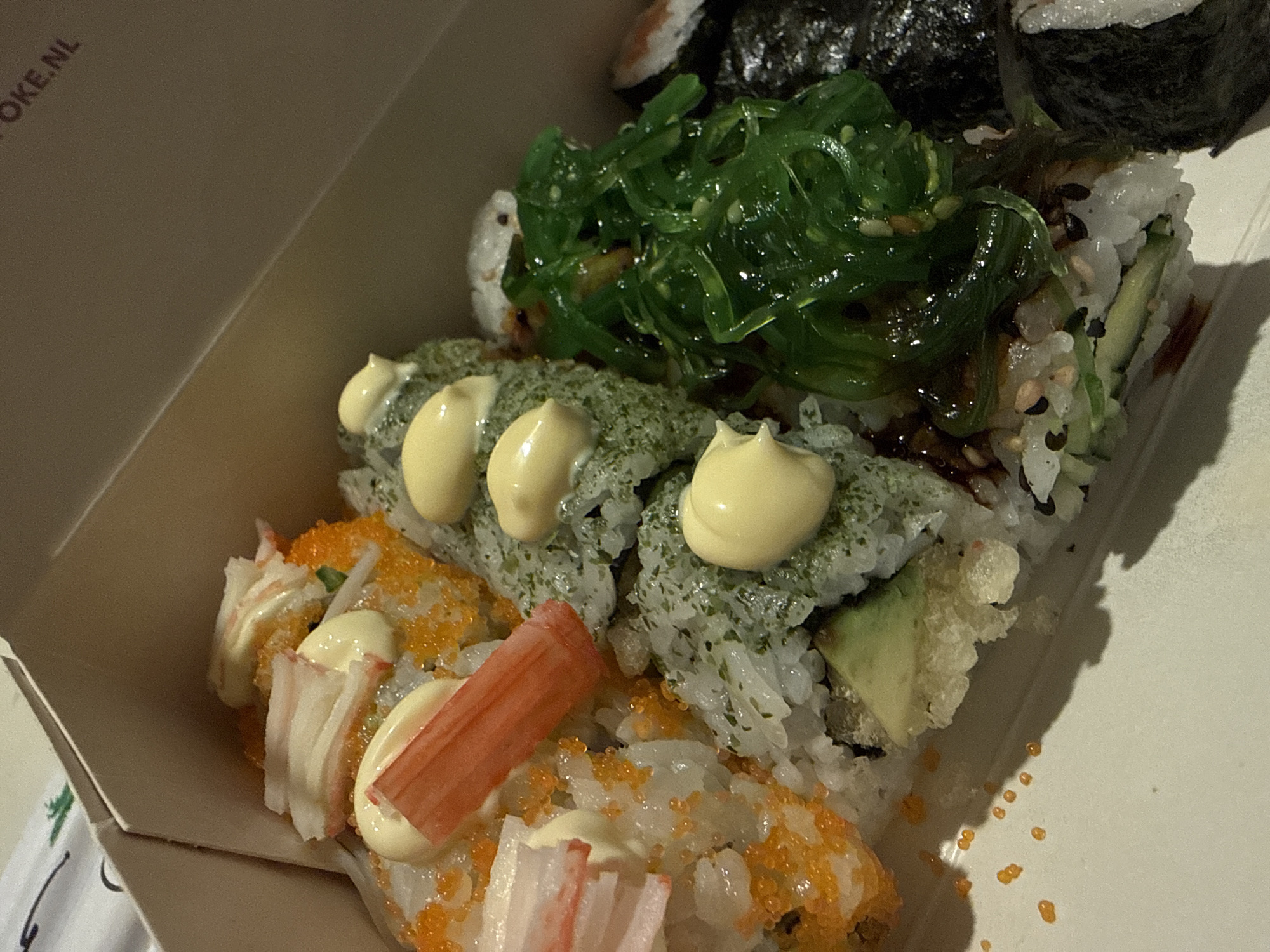 A light brown cardboard takeout box, consistent with food delivery packaging, is presented at an oblique angle, containing an assortment of sushi rolls and a side of seaweed salad. The box's interior top flap displays the partial URL "OKE.NL" in dark brown lettering. Within the box, on the left, are multiple sushi rolls, appearing to be California-style, composed of white rice covered in numerous bright orange fish roe (tobiko or masago). These rolls are topped with several thin, pale pink and white strips of imitation crab meat (surimi) and generous dollops of a thick, pale yellow creamy sauce, likely mayonnaise or aioli. Adjacent to these, centered in the box, are other sushi rolls coated in a green, finely chopped seasoning, consistent with furikake or a type of dried seaweed. These rolls also feature similar pale yellow sauce dollops on their tops, and some show visible slices of light green avocado within their structure. To the right, a distinct portion of vibrant, dark green wakame seaweed salad, appearing glossy from a dressing, fills a section of the box. A dark, possibly nori-wrapped sushi roll is partially visible on the far right. Scattered orange fish roe are visible on the bottom surface of the box on the left side. The packaging indicates the food originates from "O-KE Sushi & Poke," an establishment with a confirmed location in The Hague, Netherlands. The background outside the box is indistinct, with a faint light-colored textile pattern visible in the upper left corner.