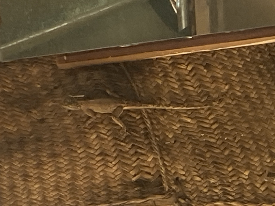 A small, light brown lizard is observed clinging vertically to a woven wall, located in Barden Yana, Nigeria. The wall exhibits a tight, intricate chevron or herringbone weave pattern, composed of natural, light brown plant fibers. The lizard, oriented with its head towards the top of the frame and its body extending downwards, displays a long, slender tail. To the immediate right of the lizard, a vertical dark brown wooden frame or beam delineates the woven surface from an angled, partially visible reflective surface, which appears metallic or glassy. No other individuals or active interactions are present in the scene. The ambient lighting appears dim, casting warm tones across the textured surfaces.