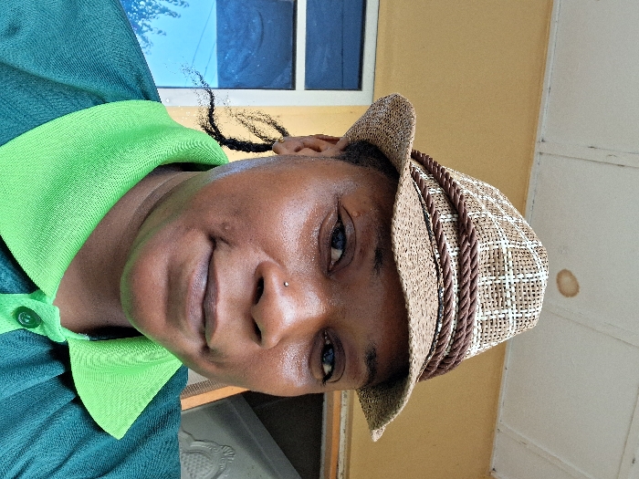 A dark-skinned individual, appearing female, is centered in a medium-close-up photograph. They exhibit a neutral to slight smiling expression, with a small silver stud piercing in the left nostril and a small blemish or mark on the right cheek. Dark braided hair strands are visible near the left ear. The individual wears a brown and white checkered woven fedora-style hat adorned with a triple-braided dark brown cord band. Below the hat, a dark green polo shirt with a bright lime green collar and two visible green buttons is worn. The background consists of a light yellow-ochre painted wall. To the left, a section of a window or door frame with blue-tinted glass is visible. The ceiling above is white, showing structural lines and a circular brown stain. A partially visible light-colored object with a raised, intricate design is present on the right background. The image is situated in Hotoro North, Nigeria.