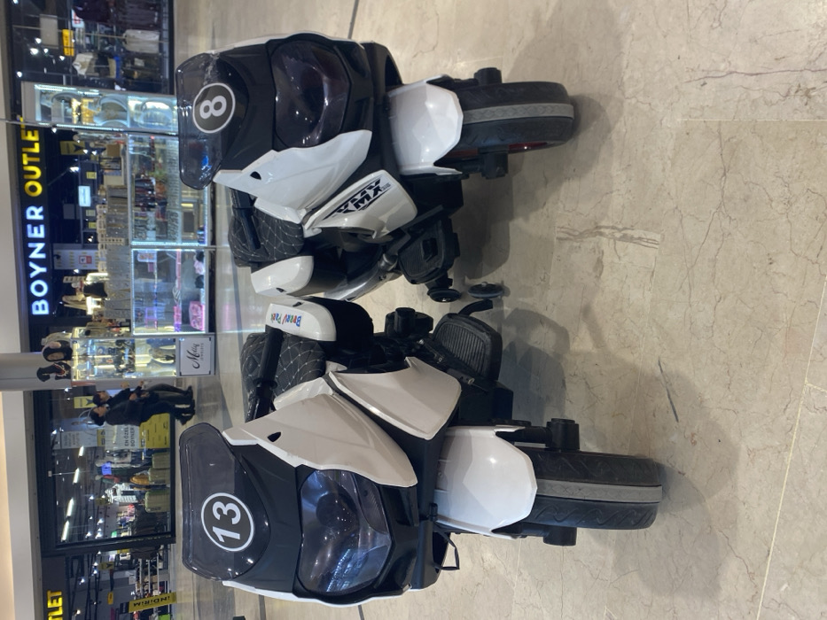 Two white and black toy motorcycles are parked side-by-side on a tiled floor. One has a number "8" on its front screen, while the other shows "13." A shopping mall interior is visible in the background with store names like "BOYNER OUTLET." The toys appear to be in a public space within the mall, possibly for entertainment purposes.