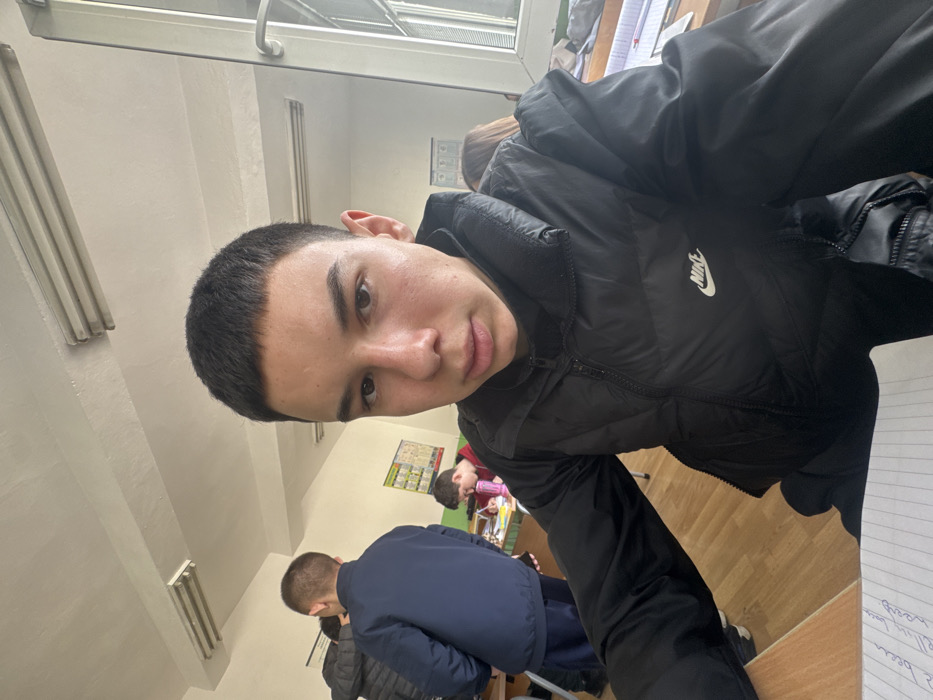 The image depicts an indoor classroom setting within a school in Troyan, Bulgaria. In the immediate foreground, a young male with short, dark hair and a neutral expression looks directly at the camera, capturing a selfie. He is wearing a black quilted puffer jacket with a white Nike logo on the left chest. His left arm is partially visible, resting on a light-colored wooden desk, where a ruled notebook with handwritten text is open. In the midground to the left, another young male, seen from behind, wears a dark blue jacket and stands or sits by a desk. Further back, a third individual wearing a red top is observed leaning over a desk. The walls are light-colored, and a green-framed chart or poster with white background elements is affixed to the left wall. To the right of the central subject, a large window with white frames provides natural light. A portion of a white grid or screen is visible within the window structure. The top of another individual's head is partially visible just behind the main subject, to the right. The white ceiling features two linear fluorescent light fixtures, each containing three tubes. The floor appears to be wooden.