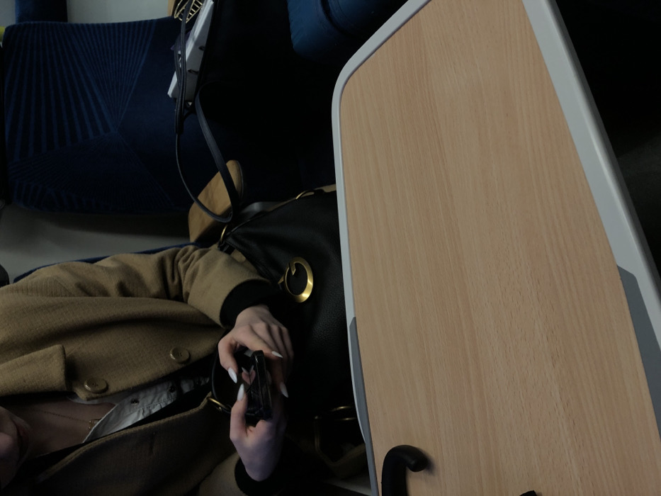 person seated on a train or airplane, wearing a brown coat and holding a cell phone with white nails. A black purse rests on the person's lap. A wooden tray table with a white border is positioned in front of the person. The seat is blue. The lighting is soft.