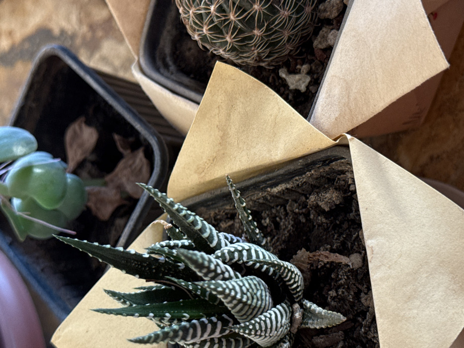 The scene, set in Armavir, Armenia, captures a close-up, high-angle view of three potted succulent plants. In the foreground-left, a *Haworthiopsis fasciata* (Zebra Plant) with dark green leaves and prominent white horizontal bands is rooted in dark brown soil within a black plastic nursery pot. The lower portion of this pot is partially encased in light brown, folded paper packaging. To its immediate right, another black plastic nursery pot contains a spherical cactus, dark green with distinct ribs and light brown spines, situated in a mixture of dark soil and reddish-brown gravel. This pot is also partially enveloped by similar light brown paper packaging, which forms angular folds between the two foreground plants. In the blurry background-center, a third black plastic nursery pot holds a succulent with roundish, pale green leaves, its soil appearing dry with some dark debris. The plants are arranged on an indistinct, light brown, textured surface, likely indoors. No people or active interactions are present.