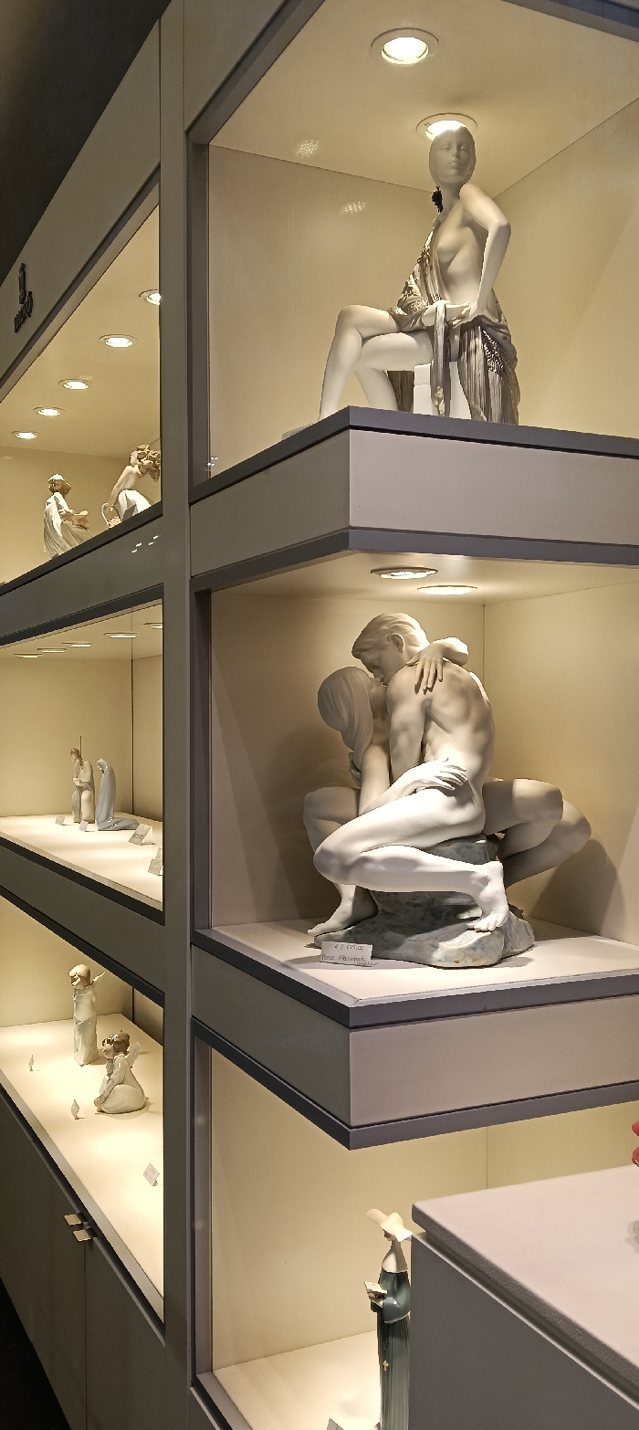 A display case features several ceramic sculptures illuminated by recessed lighting. The top shelf of the rightmost section showcases a seated female figure draped in fabric. Below, a couple is depicted in a passionate embrace. The leftmost section contains a series of smaller figurines, including a couple, angels, and a nun holding a book. The cabinets are finished in neutral tones with clean lines.
