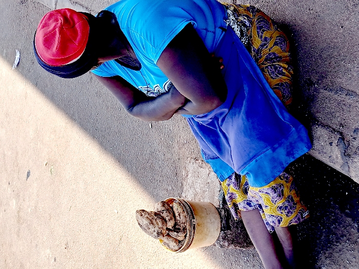 In Plumtree, Zimbabwe, an adult female is observed seated on a paved surface, likely a concrete curb, viewed from her rear-left side. She is attired in a bright blue short-sleeved top and a lower garment patterned in yellow, blue, and black. Her head is covered by a dark blue fabric wrap, topped with a red cap. Her arms are crossed over her chest, and her legs extend forward along the ground. Adjacent to her left, a cream-colored plastic bucket, appearing worn, contains several light brown, irregularly shaped tubers. This bucket rests upon a dark, irregular stone block. The ground surface is light-colored pavement, possibly asphalt or concrete, with a distinct diagonal shadow cast across it. The scene occurs outdoors, under strong directional sunlight.