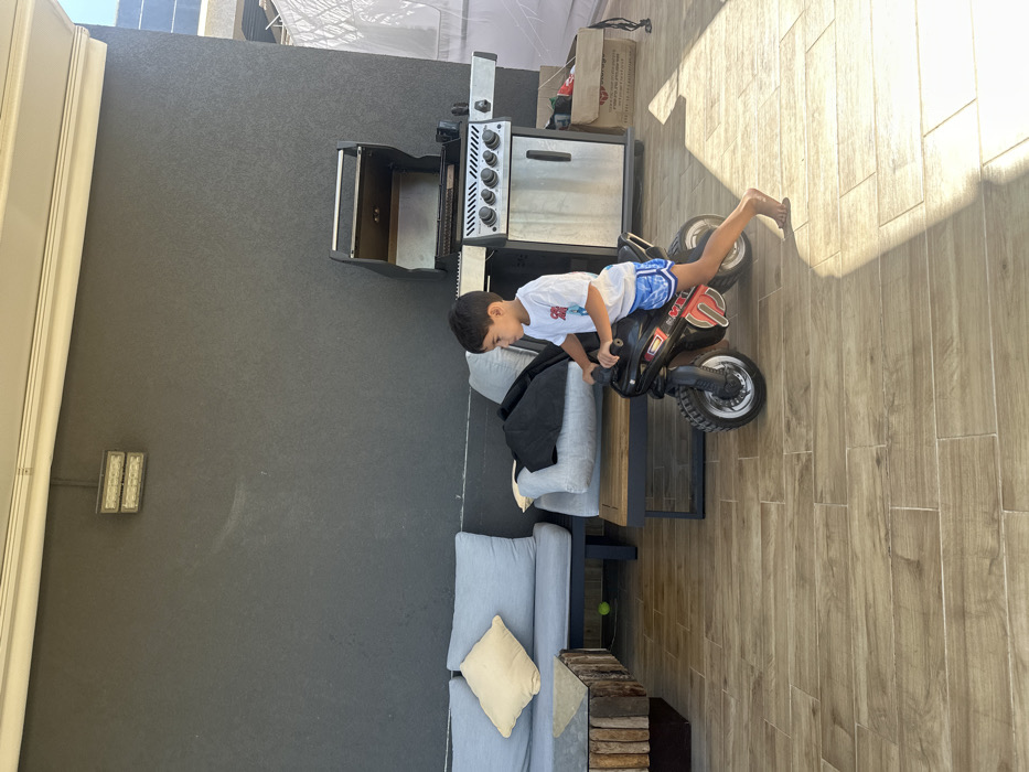 A young barefoot boy, wearing a white t-shirt and blue patterned shorts, is seated on a black toy motorcycle with red accents, propelling himself forward with his feet. The scene unfolds on an outdoor patio or balcony in Rishon LeZion, Israel, featuring light brown, wood-effect tiled flooring. Bright sunlight illuminates the area, casting distinct shadows. Against a dark grey textured wall, a grey outdoor sofa with light grey cushions and a single cream throw pillow is positioned on the left. Adjacent to the sofa is a rectangular coffee table constructed from stacked wooden planks and a black metal frame. A small light-green ball is visible underneath the sofa. To the right, a second grey outdoor sofa is partially visible, draped with a black garment. Further right along the wall stands a stainless steel gas grill with its lid open, revealing internal grates. Beside the grill, a cardboard box labeled with Hebrew text ("סאטוק סטורג'") and other miscellaneous items are present. Two rectangular LED floodlights are mounted on the dark grey wall above the sofa area. In the far background on the right, white translucent netting or tarp is visible.