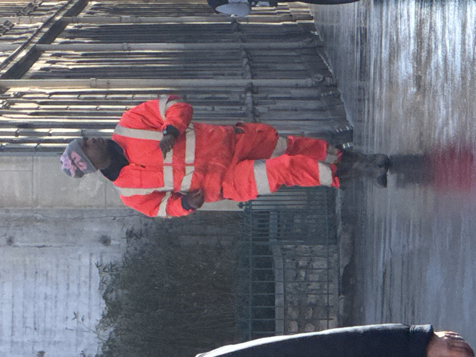 A man walks forward on a wet, reflective paved surface, likely a street or quayside in Paris, France. He is a male of apparent Black ethnicity, wearing a bright orange two-piece work uniform with multiple horizontal and vertical reflective white stripes on the jacket and trousers. A black high-collar garment is visible beneath his jacket. He wears a grey knit beanie with a pink or light-colored pattern on his head and dark work boots. A dark-colored watch is visible on his left wrist. His right arm is slightly forward, and his left arm is slightly back, indicating motion. In the foreground on the left, the left arm and torso of another individual, wearing a dark jacket, are partially visible. The background on the left features a light-colored stone wall partially obscured by green foliage and a dark metal railing. The background on the right displays a tall, dark, ornate metal gate or fence structure with numerous vertical elements. The ground is wet, reflecting light and portions of the man's orange attire.