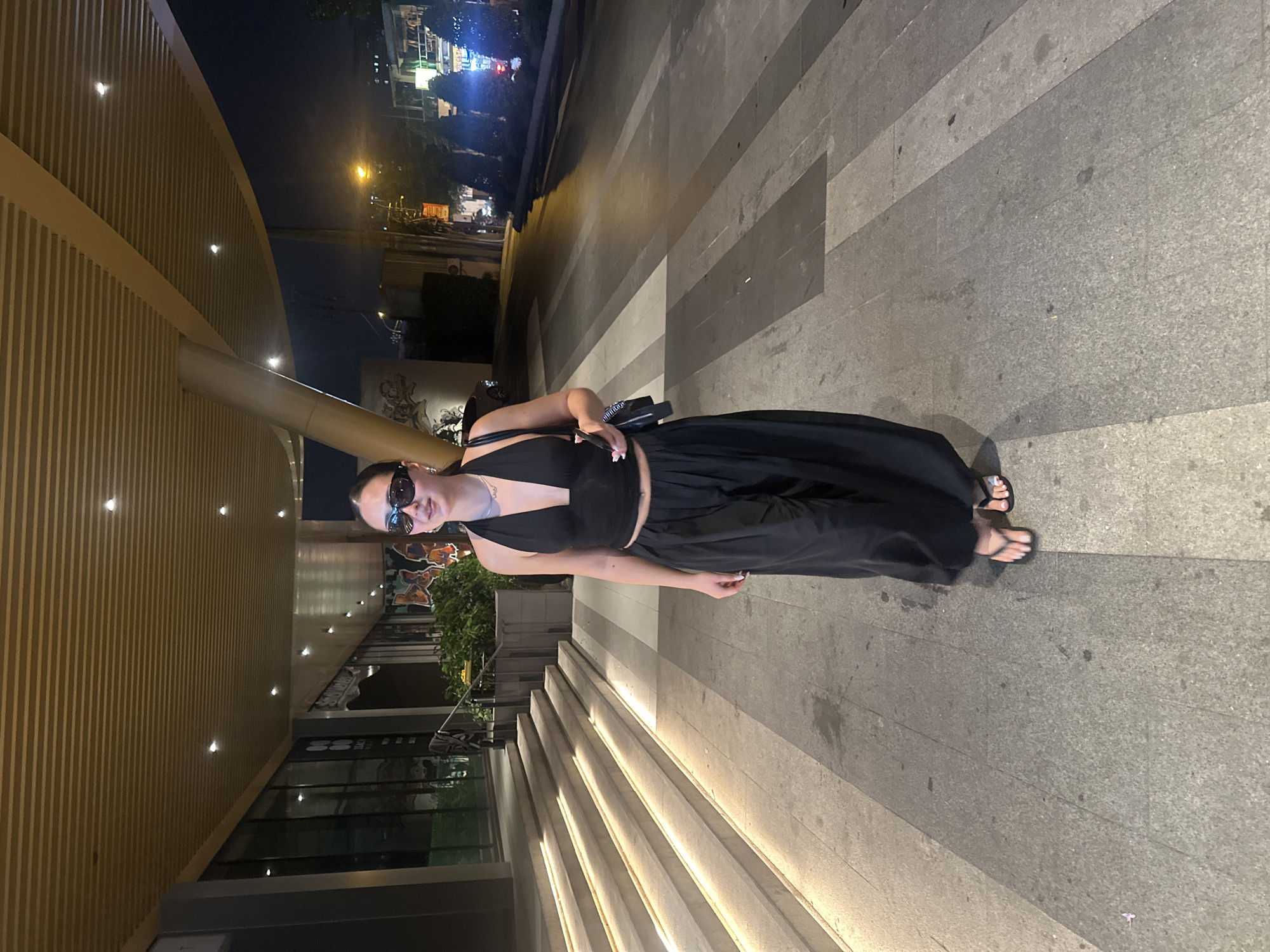 An evening scene depicts a female subject walking on a paved urban walkway under a modern architectural canopy in Thủ Đức City (formerly District 2), Ho Chi Minh City, Vietnam. The subject, a woman with dark hair pulled back and wearing dark rectangular sunglasses, is centrally positioned and faces slightly towards the camera. She is dressed in a black halter-neck crop top, black wide-leg pants, and black flip-flops. A silver necklace is visible on her neck, and she holds a dark-colored handbag or clutch and a smartphone in her left hand. Her toenails are painted white. To the left of the subject, illuminated concrete steps ascend towards a building entrance featuring large glass panels and multiple storefronts. Partially visible signage includes the name "ISAC" with a logo of concentric squares, and further down, the name "SnoWhaite". Green foliage in planters is situated near the building. A metal railing parallels the steps. Above the walkway, a slatted canopy with integrated recessed lighting extends, providing overhead cover. A large, inclined support column rises from the ground to the canopy, positioned to the subject's right. The ground is paved with rectangular stone or concrete tiles in varying shades of gray, showing some minor stains. To the right and beyond the paved area, an asphalt street with a partially visible pedestrian crossing is present. The street is lined with conical-shaped green bushes. In the background, beyond the street, distant urban buildings, streetlights, and vehicle lights indicate an active city environment at night. The sky is dark.